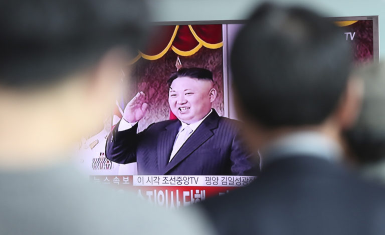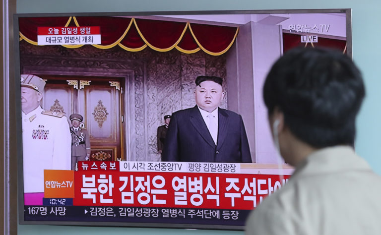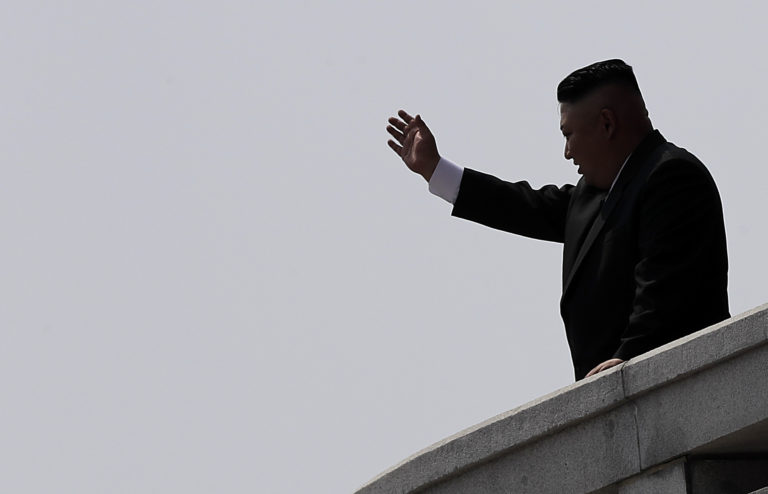 Severokórejský vodca Kim Čong-un počas vojenskej prehliadky na počesť 105. výročia narodenia zakladateľa KĽDR Kim Ir-sena. Pchjongjang, 15. apríl 2017. Foto: SITA/AP