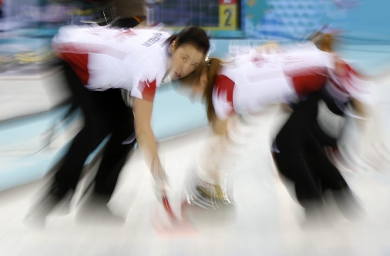 Kanadské reprezentantky v curlingu počas štvrtkového zápasu v rámci olympijského turnaja. Foto: SITA/AP
