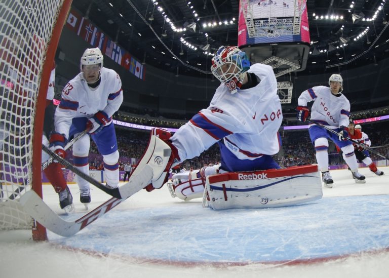 Nórsky brankár Lars Haugen počas štvrtkového zápasu v rámci olympijského hokejového turnaja, v ktorom jeho tím prehral s favorizovanou Kanadou 1:3. Foto: SITA/AP
