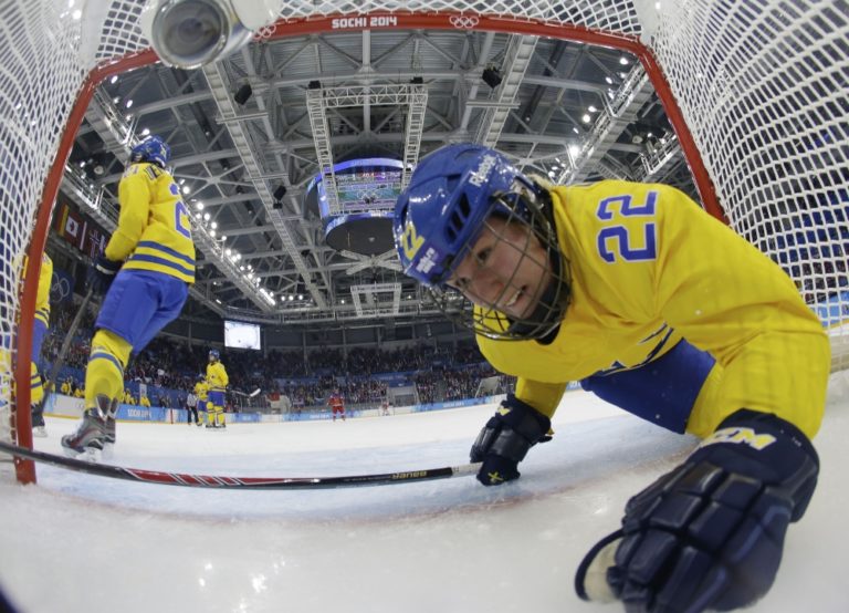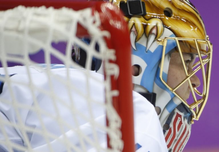 Gólman Slovincov Robert Kristan počas zápasu s Ruskom na hokejovom turnaji v Soči v rámci ZOH 2014. Rusko, Soči, 13. februára 2014. Foto: SITA/AP