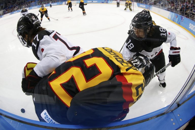 Japonské hokejistky Yuka Hiranová a Tomoko Sakagamiová v súboji s Nemkou Kerstin Spielbergerovou počas štvrtkového zápasu v rámci ženského olympijského hokejového turnaja. Foto: SITA/AP