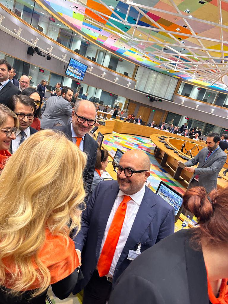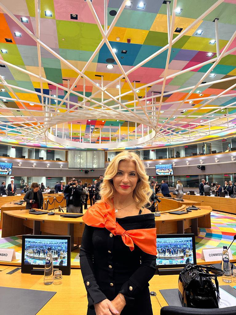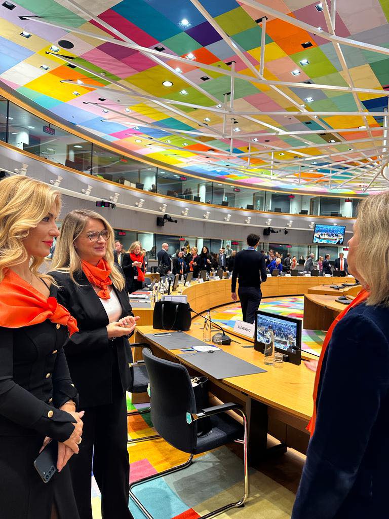 Ako symbol k Dňu boja proti násiliu páchanom na ženách, ktorý pripadol na 25. novembra, sa ministerka Šimkovičová na rokovaní v Bruseli objavila s oranžovou šatkou na pleci. Facebook/Ministerstvo kultúry Slovenskej republiky