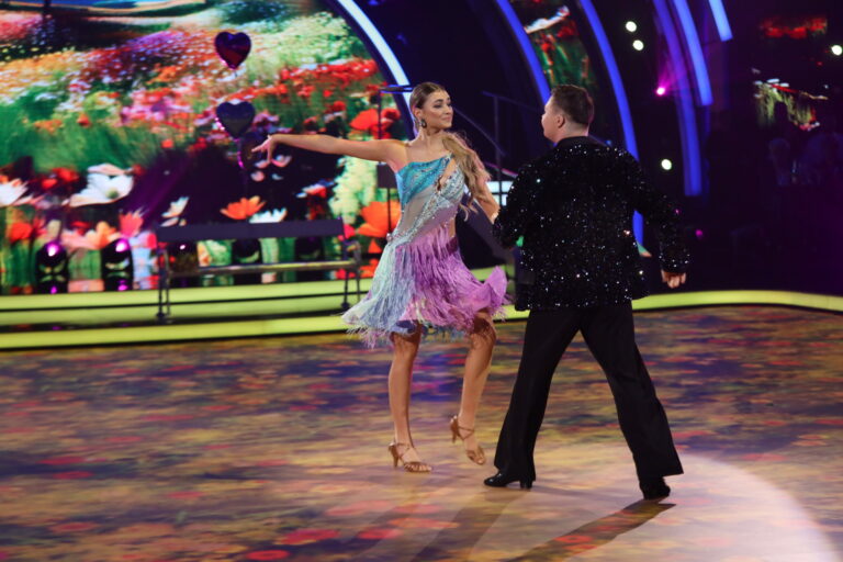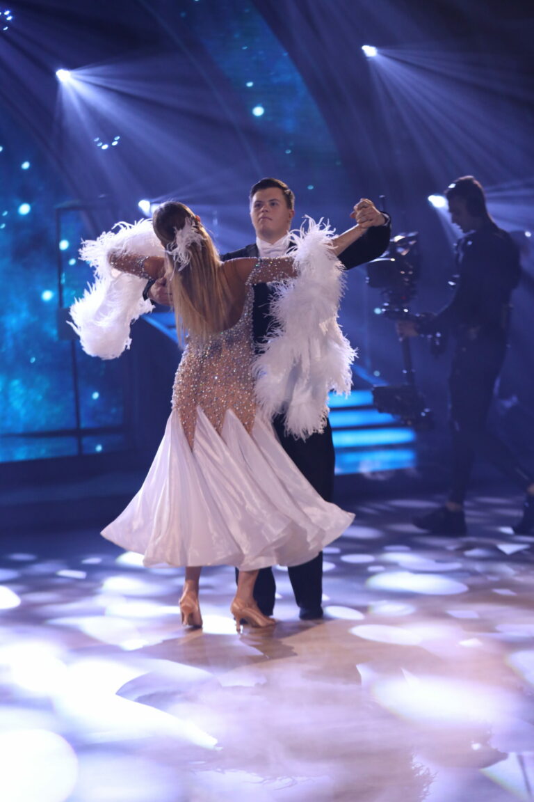 Šimon Jakuš a Patrícia Piešťanská počas prvého priameho prenosu Let’s Dance 2025 (2. marec 2025). Foto: TV Markíza.