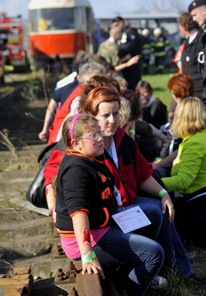 Simulovaný záchranársky zásah na najvyššej úrovni pri hromadnej nehode osobného vlaku s autobusom so sedemdesiatimi zranenými, ktorých zachraňujú tímy zo Slovenska a Rakúska. Bratislava, 18. október 2014. Foto: SITA/Ján Slovák
