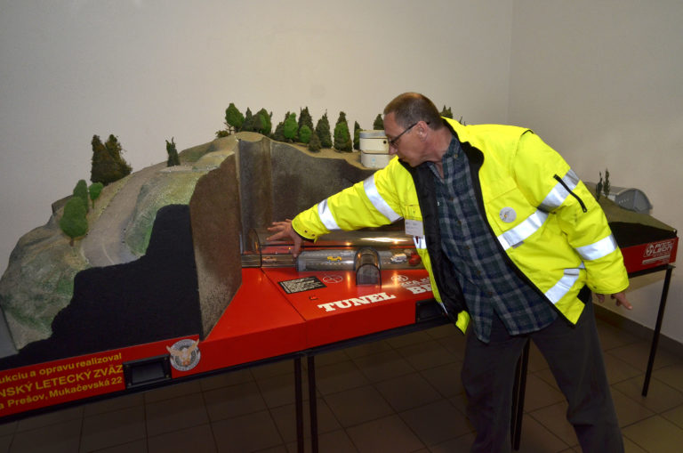 Bezpečnostný technik pre tunely NDS Peter Schmidt ukazuje miesto zásahu na makete tunela počas súčinnostného cvičenia zložiek Integrovaného záchranného systému (IZS) a Národnej diaľničnej spoločnosti (NDS) v tuneli Branisko. Beharovce, 26. apríl 2017. Foto: SITA/Radoslav Maťaš