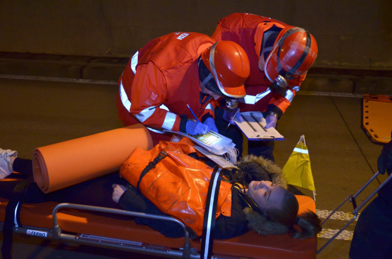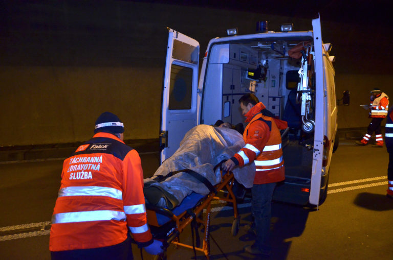 Nakladanie figurantky do sanitky počas súčinnostného cvičenia zložiek Integrovaného záchranného systému (IZS) a Národnej diaľničnej spoločnosti (NDS) v tuneli Branisko. Široké, 26. apríl 2017. Foto: SITA/Radoslav Maťaš