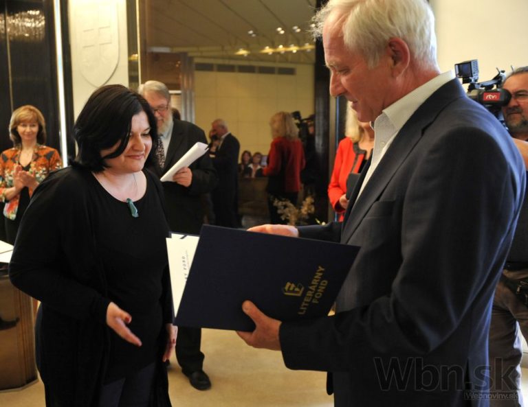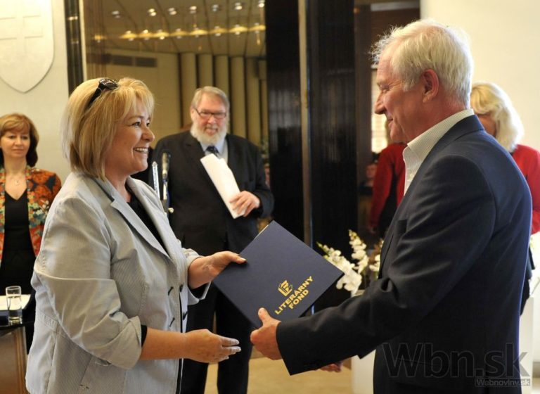 Zľava: Redaktorka a publicistka Rádia Slovensko RTVS Ľubica Hargašová a riaditeľ Literárneho fondu Ladislav Serdahély počas odovzávania cien Literárneho fondu za novinársku tvorbu v roku 2013. Hargašová bola ocenená za svoju prácu v rubrike Naši a svetoví. (Bratislava, 6. máj 2014) Foto: SITA/Ján Slovák