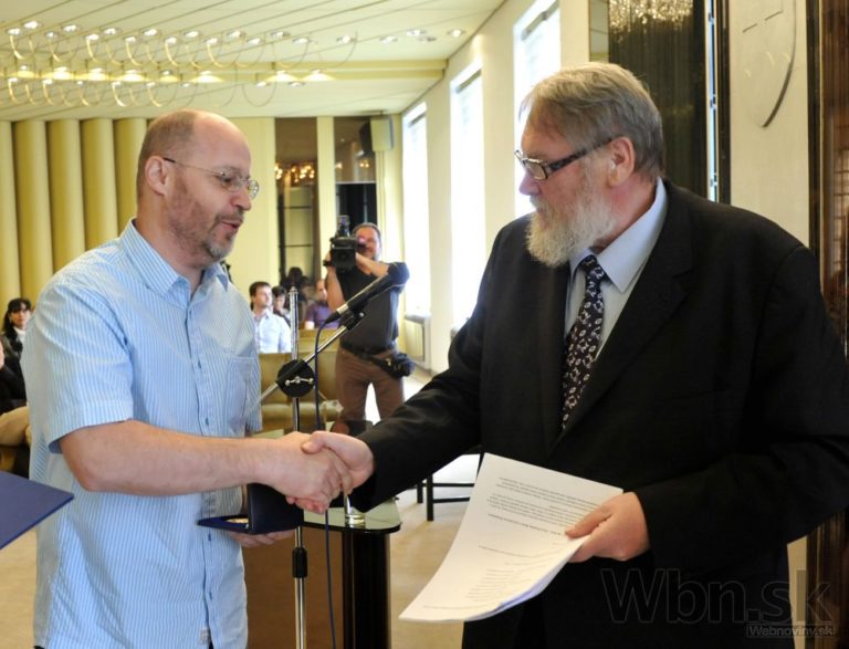 Zľava: Redaktor týždenníka Šarm Ján Dzúr a predseda poroty Ferdinand Tisovič počas odovzávania cien Literárneho fondu za novinársku tvorbu v roku 2013. Dzúr bol ocenený za reportáže Posledný, Biznis v Las Ľubovni a Potemkinove mosty. (Bratislava, 6. máj 2014) Foto: SITA/Ján Slovák