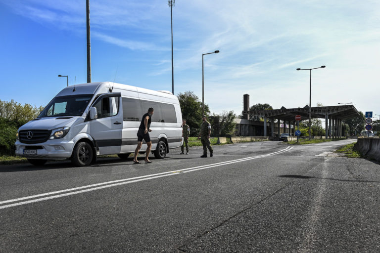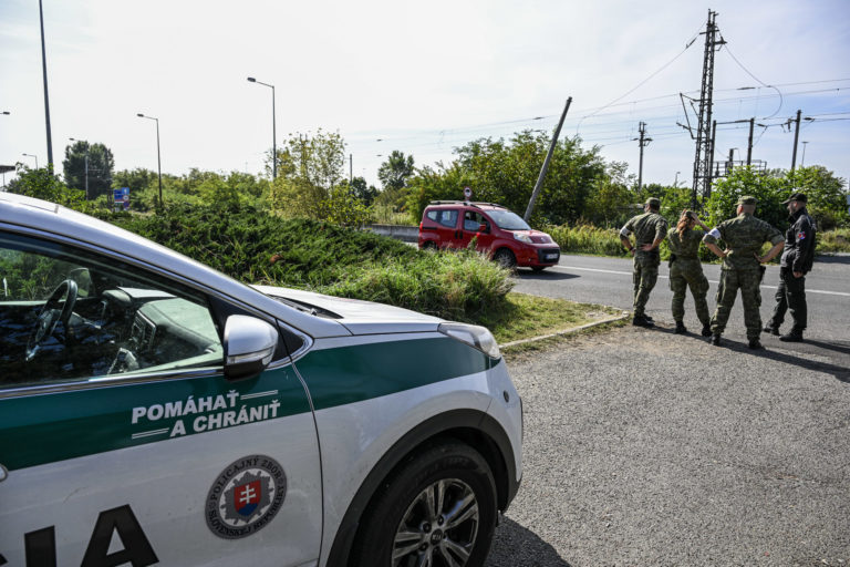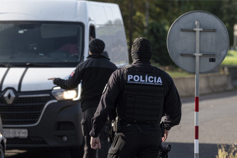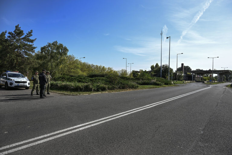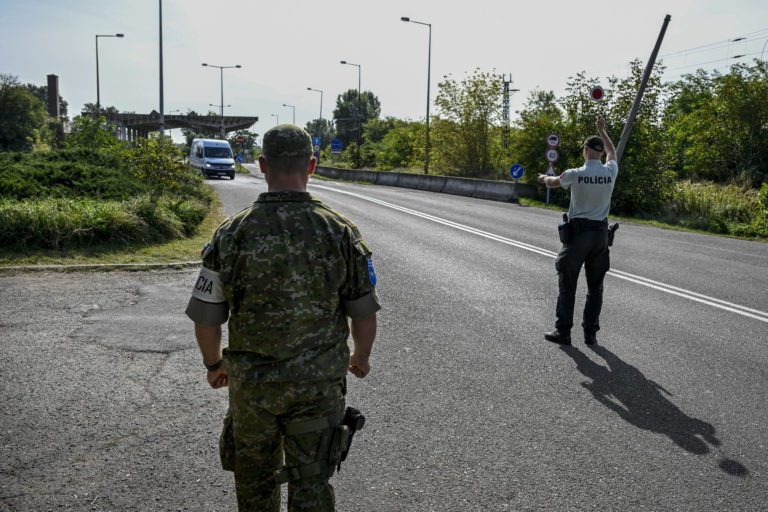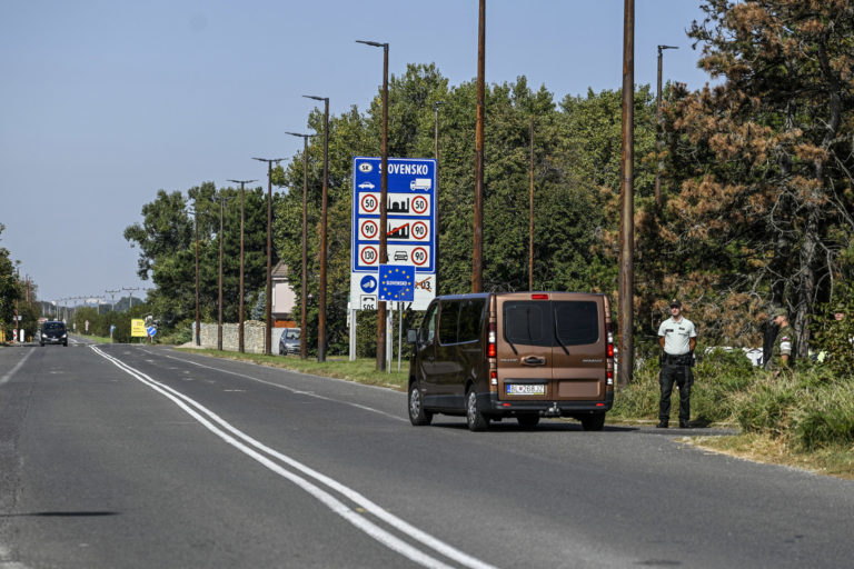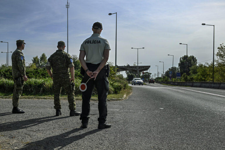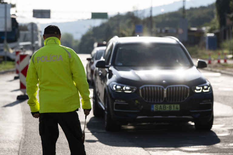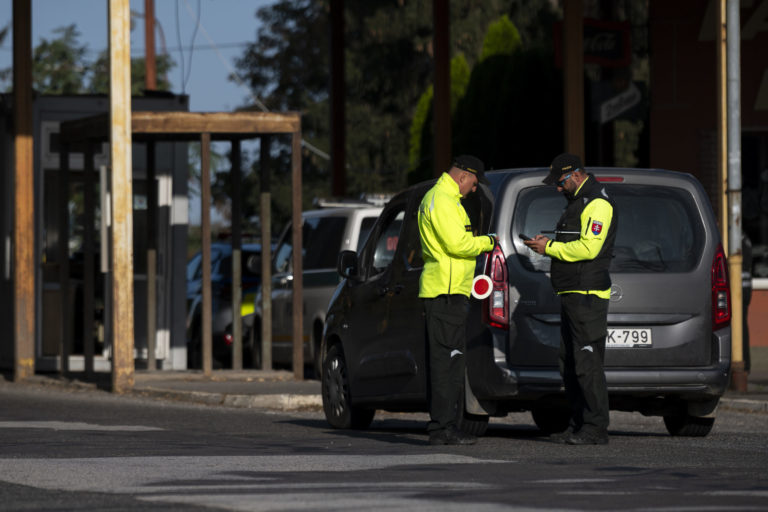 Slovenskí policajti kontrolujú vozidlá na maďarsko-slovenskom hraničnom priechode na juhu Slovenska vo štvrtok 5. októbra 2023. Slovensko začalo vo štvrtok vykonávať dopravné kontroly na hraniciach so susedným Maďarskom. Dramatický nárast počtu migrantov prechádzajúcich na slovenské územie, ktoré je súčasťou návalu podobných hraničných opatrení, ktoré v posledných dňoch zaviedli iné stredoeurópske krajiny. Peter Komka/MTI via AP