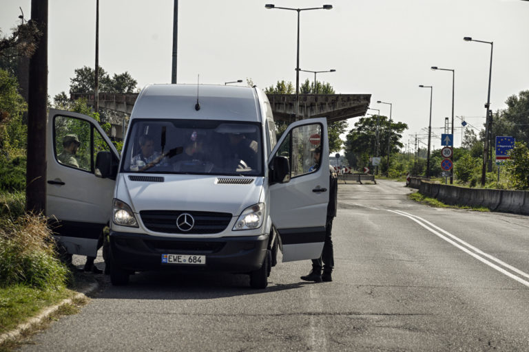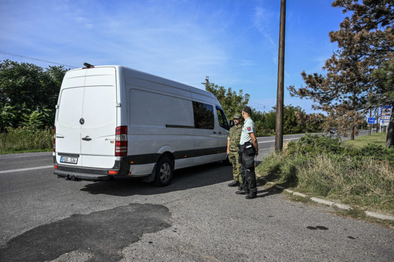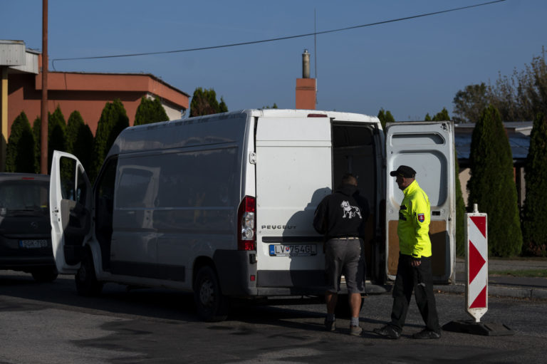 Policajti kontrolujú autá a dodávky na slovensko-maďarských hraniciach v slovenských Šahách vo štvrtok 5. októbra 2023. Foto: SITA/AP