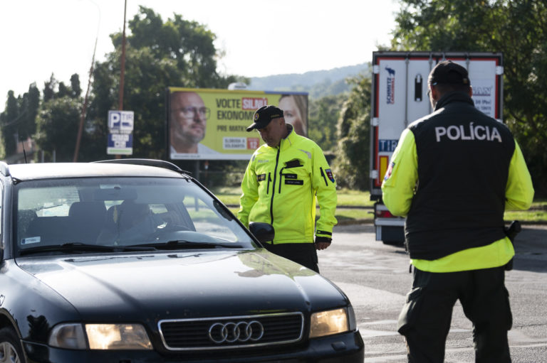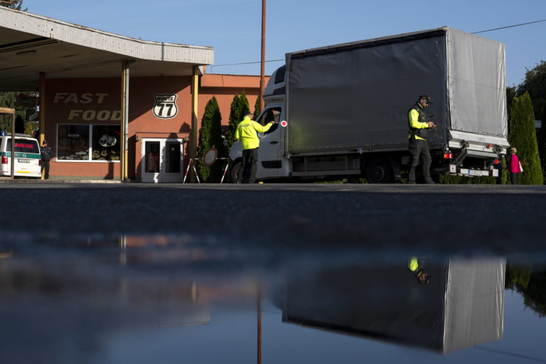 Slovenskí policajti kontrolujú vozidlá na maďarsko-slovenskom hraničnom priechode. Foto: SITA/AP
