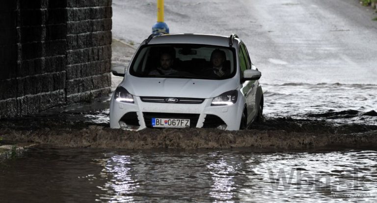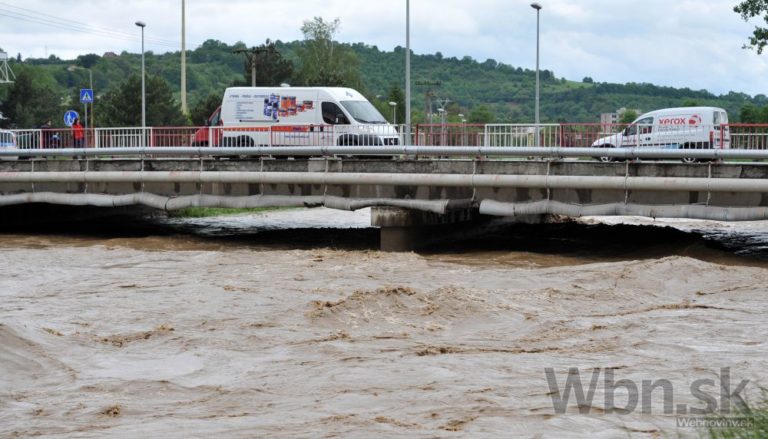 Vyliata voda z rieky Torysa na Jilemnického ulici v Prešove. Medzi najohrozenejšie lokality po nočných búrkach patria tiež ulice Pod kamennou baňou, Budovateľská a Pod Wiliec hôrkou. Prešov, 16. máj 2014.