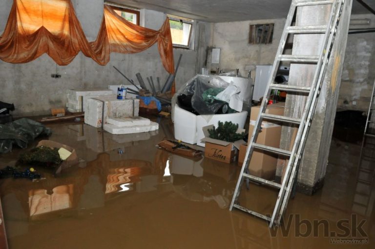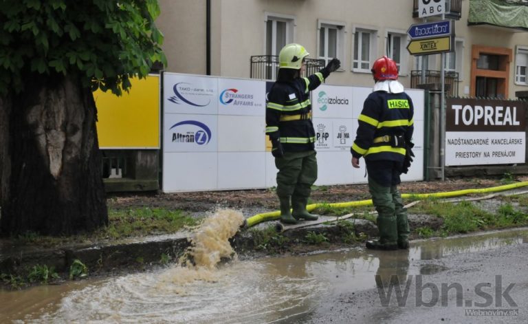Hasiči odčerpávajú vodu na Budovateľskej ulici v Prešove, kde sa vyliala voda v súvislosti so stúpajúcou hladinou rieky Torysa. Medzi najohrozenejšie lokality po nočných búrkach patrili v Prešove ulice Pod kamennou baňou, Budovateľská, Jilemnického a Pod Wiliec hôrkou. Prešov, 16. máj 2014. Foto: SITA/Viktor Zamborský