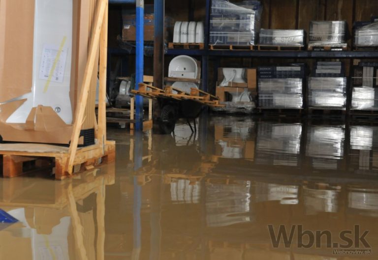 Voda vo firme na Jilemnického ulici spôsobila škody na uskladnenom tovare. Medzi najohrozenejšie lokality po nočných búrkach patria v Prešove ulice Pod kamennou baňou, Budovateľská, Jilemnického a Pod Wiliec hôrkou. Prešov, 16. máj 2014. Foto: SITA/Viktor Zamborský