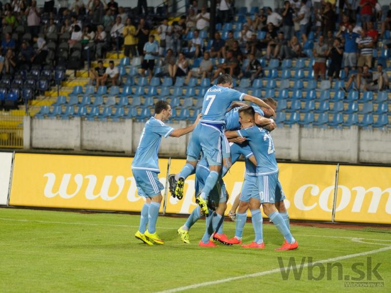 Sprava: Adam Zreľák zo Slovana po prvom góle, Marko Milinkovič a Jakub Podaný počas 2. predkola Európskej ligy 2015/2016 medzi ŠK Slovan Bratislava (SR) - University College Dublin (Ír.) Bratislava, 16. júl 2015 Foto: SITA/Robert Tappert