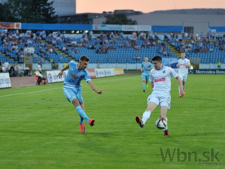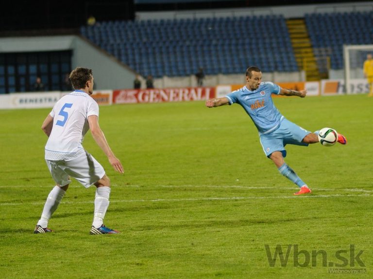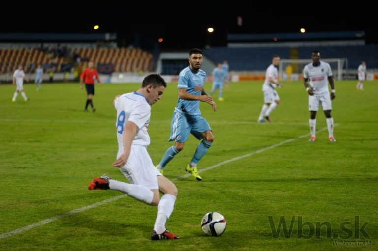 Zľava: Róbert Vittek zo Slovana a Mark Langtry z University College počas 2. predkola Európskej ligy 2015/2016 medzi ŠK Slovan Bratislava (SR) - University College Dublin (Ír.). Bratislava, 16. júl 2015 Foto: SITA/Robert Tappert