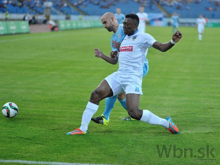 Sprava: Maxim Kouogun z University College a slovák Róbert Vittek zo Slovana počas 2. predkola Európskej ligy 2015/2016 medzi ŠK Slovan Bratislava (SR) - University College Dublin (Ír.) Bratislava, 16. júl 2015 Foto: SITA/Robert Tappert