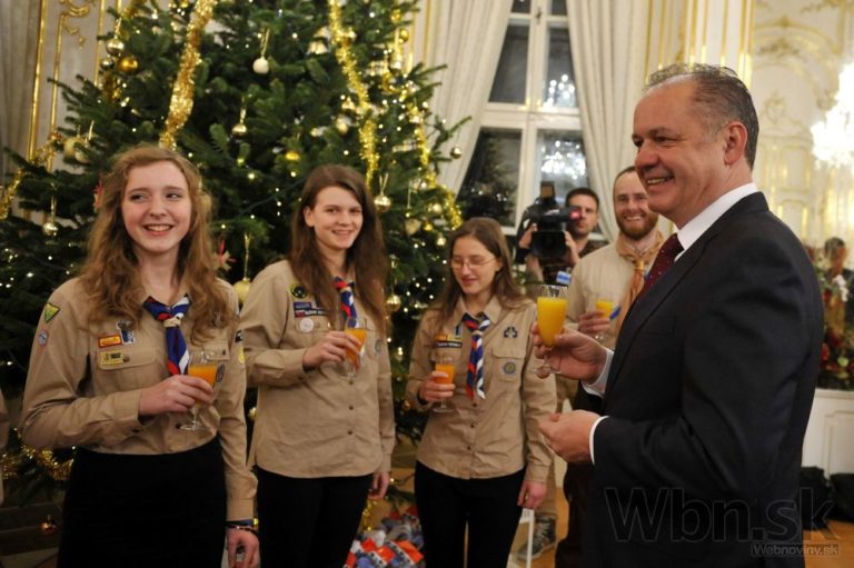 Prezident SR Andrej Kiska (v strede) počas prijatia zástupcov slovenských skautov, ktorí prišli odovzdať Betlehemské svetlo - plamienok z Baziliky Narodenia Pána vo Svätej zemi. Bratislava, 13. december 2014. Foto: SITA/Ján Slovák