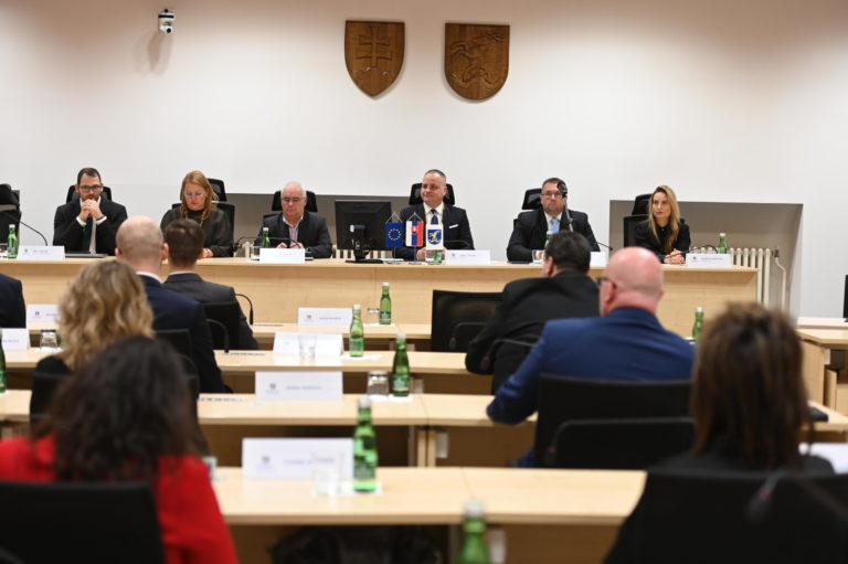 Znovuzvolený predseda BSK Juraj Droba (v pozadí tretí zľava) počas ustanovujúceho zasadnutia Zastupiteľstva Bratislavského samosprávneho kraja (BSK). Bratislava, 22. november 2022. Foto: SITA/BSK
