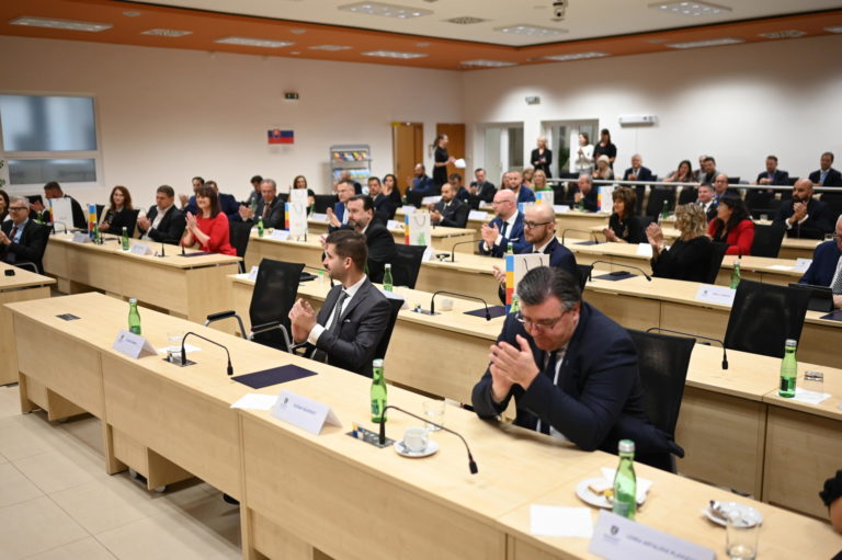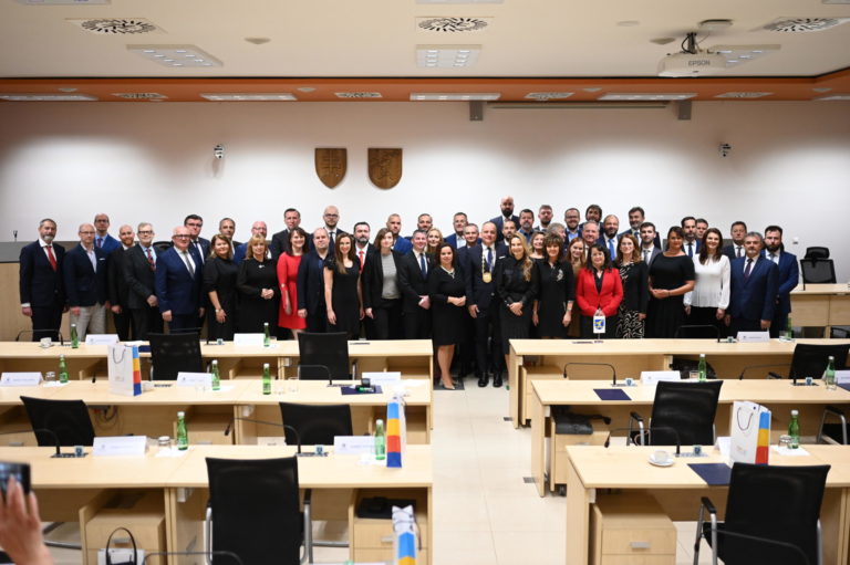 Znovuzvolený predseda BSK a novozvolení poslanci Zastupiteľstva BSK počas ustanovujúceho zasadnutia Zastupiteľstva Bratislavského samosprávneho kraja (BSK). Bratislava, 22. november 2022. Foto: SITA/BSK