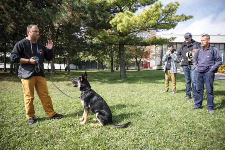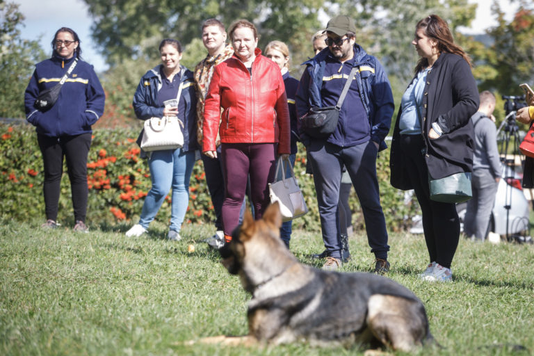 Výcvikár psov Jozef Olearčin a nemecký ovčiak Grim (vľavo v popredí) a zamestnanci pošty počas školenia poštových doručovateľov k zabráneniu útoku psa a k zníženiu rizika napadnutia psom, na ktorom inštruktori vysvetlili a predviedli, ako sa správať pri stretnutí so psom. Bratislava, 28. september 2022. Foto: SITA/Branislav Bibel
