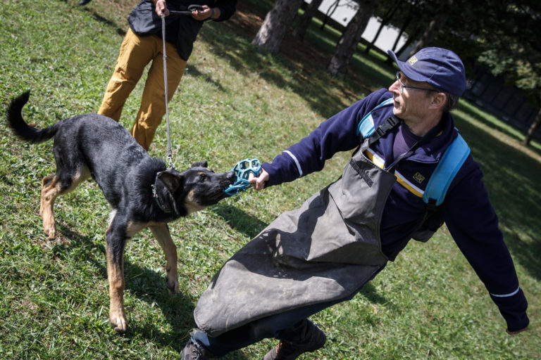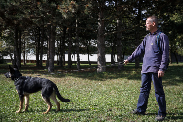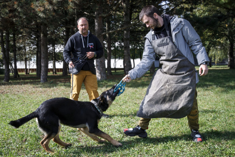 Zľava: Nemecký ovčiak Grim a zamestnanec pošty počas školenia poštových doručovateľov k zabráneniu útoku psa a k zníženiu rizika napadnutia psom, na ktorom inštruktori vysvetlili a predviedli, ako sa správať pri stretnutí so psom. Bratislava, 28. september 2022. Foto: SITA/Branislav Bibel