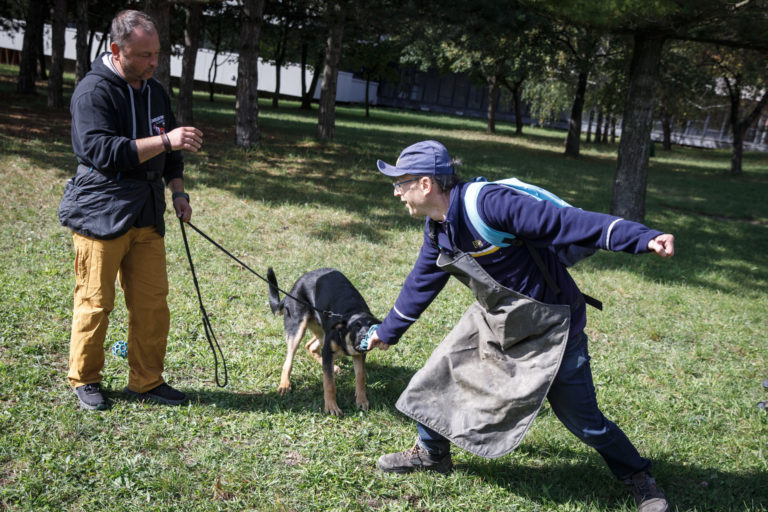 Zľava: Nemecký ovčiak Rišo a zamestnanec pošty počas školenia poštových doručovateľov k zabráneniu útoku psa a k zníženiu rizika napadnutia psom, na ktorom inštruktori vysvetlili a predviedli, ako sa správať pri stretnutí so psom. Bratislava, 28. september 2022. Foto: SITA/Branislav Bibel