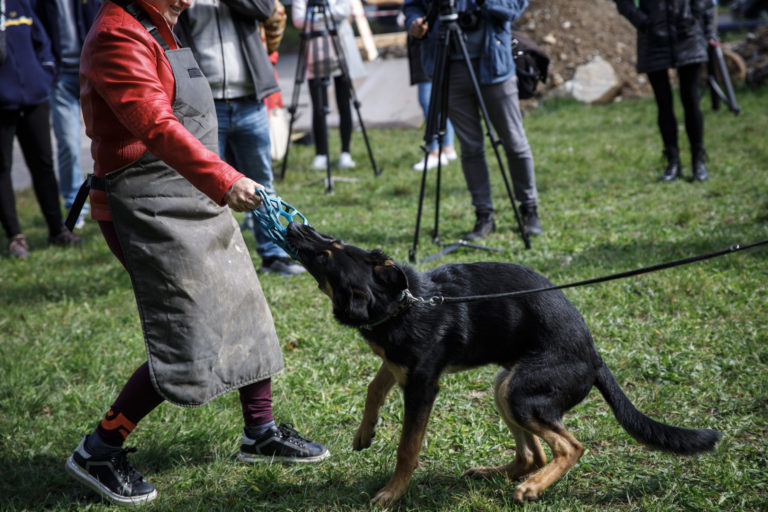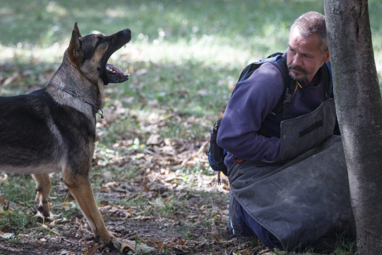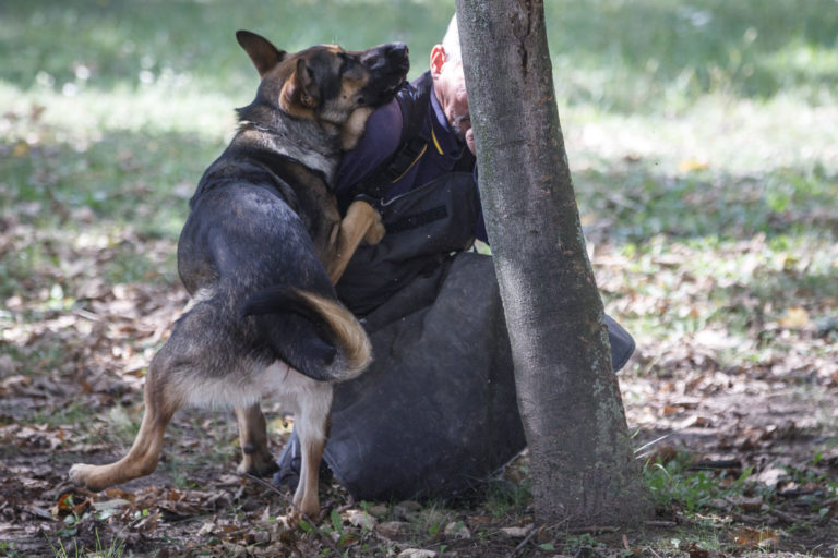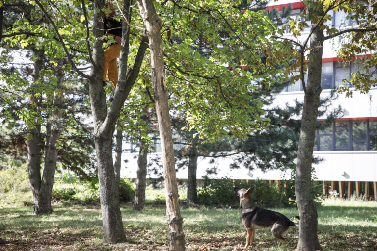 Výcvikár psov (vľavo na strome) a nemecký ovčiak Rišo (vpravo dole) počas školenia poštových doručovateľov k zabráneniu útoku psa a k zníženiu rizika napadnutia psom, na ktorom inštruktori vysvetlili a predviedli, ako sa správať pri stretnutí so psom. Bratislava, 28. september 2022. Foto: SITA/Branislav Bibel