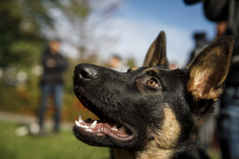 Nemecký ovčiak Grim počas školenia poštových doručovateľov k zabráneniu útoku psa a k zníženiu rizika napadnutia psom, na ktorom inštruktori vysvetlili a predviedli, ako sa správať pri stretnutí so psom. Bratislava, 28. september 2022. Foto: SITA/Branislav Bibel