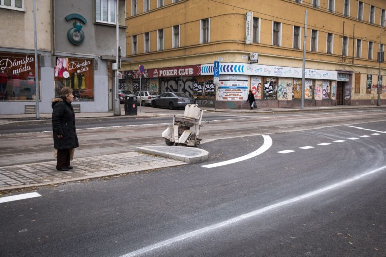 Dokončovacie práce na zastávke MHD počas technicko-bezpečnostnej skúšky na prejazd električiek po novej trati na Špitálskej ulici. Križovatku Mickiewiczova-Špitálska ulica od soboty 25. novembra sprejazdnia. Bratislava, 24. november 2017. Foto: SITA/Diana Černáková