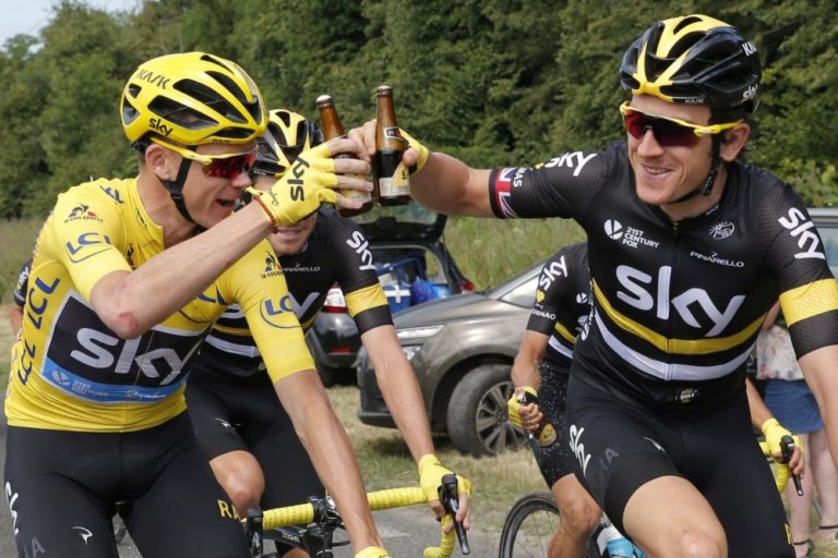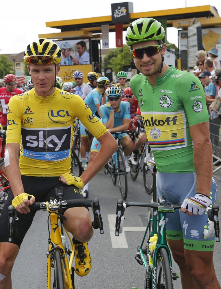 Zľava: Britský cyklista Christopher Froome a Slovák Peter Sagan pred 21. etapou Tour de France zo Chantilly do Paríža s cieľom na Elyzejských poliach. Foto: SITA/AP