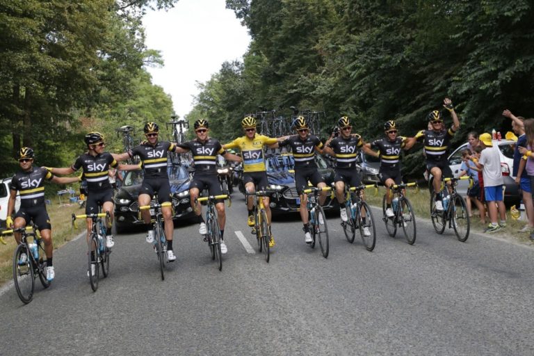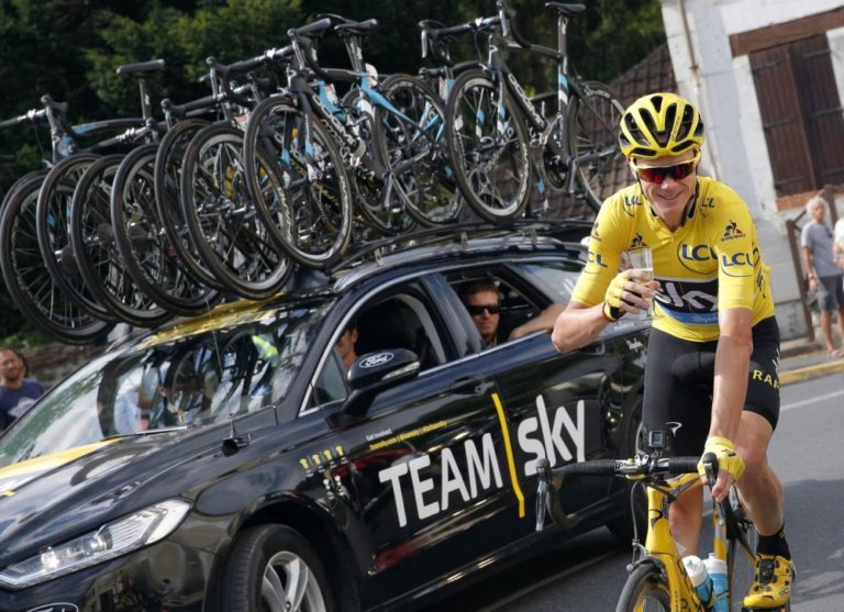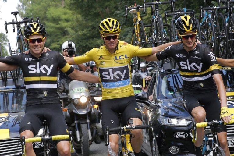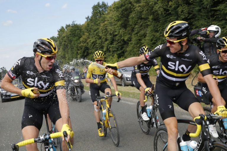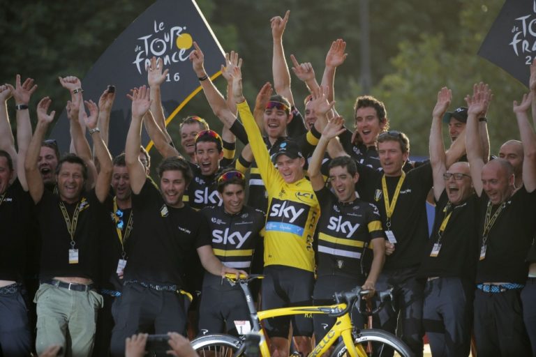 Víťaz 103. ročníka Tour de France Christopher Froome a jeho kolegovia z tímu Sky po záverečnej 21. etapy zo Chantilly do Paríža s cieľom na Elyzejských poliach. Foto: SITA/AP