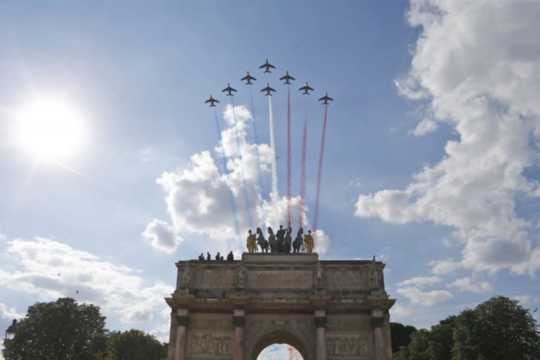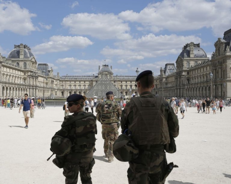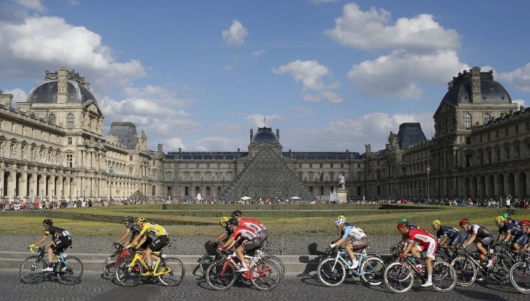 Bezpečnostné zložky pred múzeum Louvre počas 21. etapy Tour de France zo Chantilly do Paríža s cieľom na Elyzejských poliach. Foto: SITA/AP