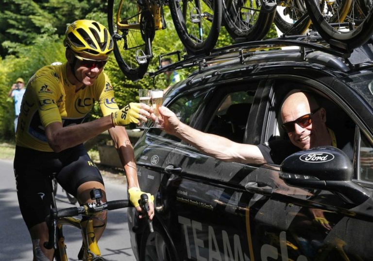 Víťaz 103. ročníka Tour de France Christopher Froome so šéfom tímu Sky Daveom Brailsfordom počas záverečnej 21. etapy zo Chantilly do Paríža s cieľom na Elyzejských poliach. Foto: SITA/AP