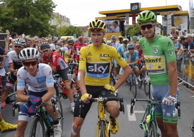 Zľava: Britskí cyklisti Adam Yates, Christopher Froome a Slovák Peter Sagan pred 21. etapou Tour de France zo Chantilly do Paríža s cieľom na Elyzejských poliach. Foto: SITA/AP