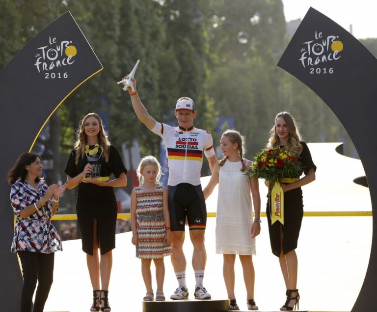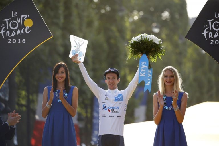 Držiteľ bieleho dresu pre najlepšieho cyklistu do 25 rokov Adam Yates na stupňoch pre víťazov po 21. etape Tour de France zo Chantilly do Paríža s cieľom na Elyzejských poliach. Foto: SITA/AP
