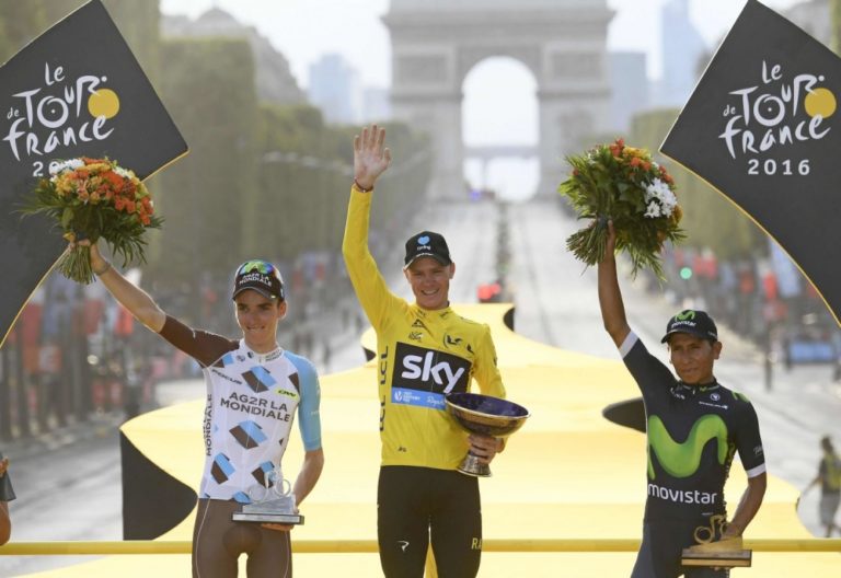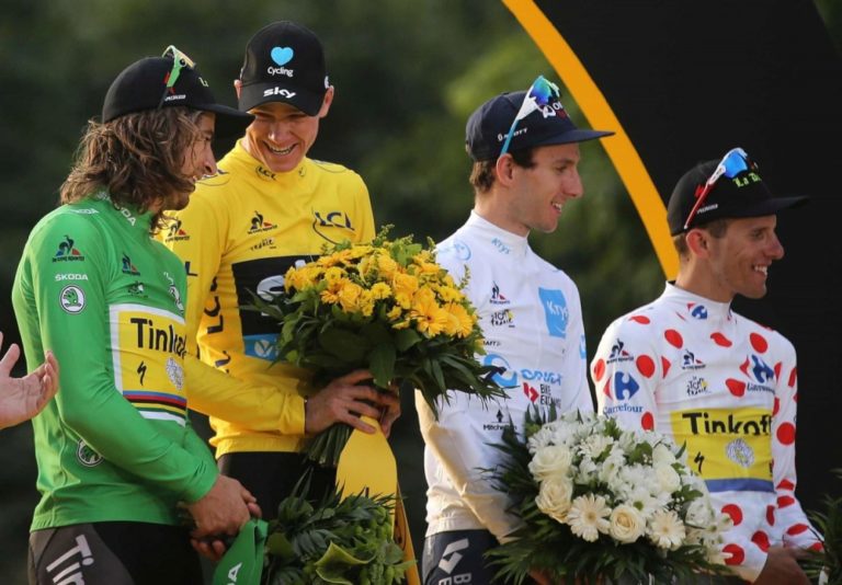 Zľava: Držiteľ bieleho dresu pre najlepšieho jazdca do 25 rokov Adam Yates, víťaz Tour de France Christopher Froome a držiteľ zeleného dresu za triumf v bodovacej súťaži Peter Sagan počas 21. etapy zo Chantilly do Paríža s cieľom na Elyzejských poliach. Foto: SITA/AP