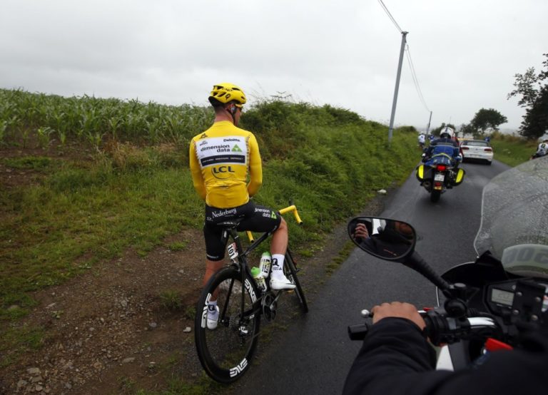 Peter Sagan v cieli druhej etapy Tour de France, ktorá štartovala v Saint-Lô a po 183 km vrcholila v Cherbourg-en-Cotentin. Slovenský cyklista v nej zvíťazil. Foto: SITA/AP