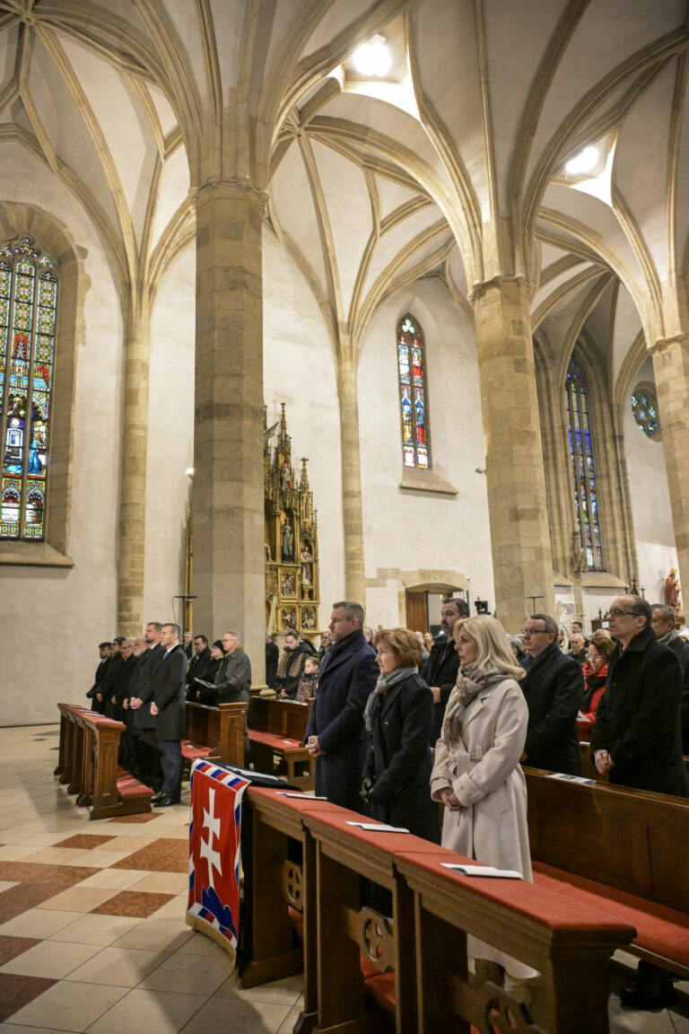 Prezident SR Peter Pellegrini (tretí sprava v popredí) počas slávnostnej svätej omše, ktorá sa konala pri príležitosti štátneho sviatku výročia vzniku Slovenskej republiky v Katedrále sv. Martina v Bratislave. Bratislava, 1. január 2025. Foto: SITA/Milan Illík.