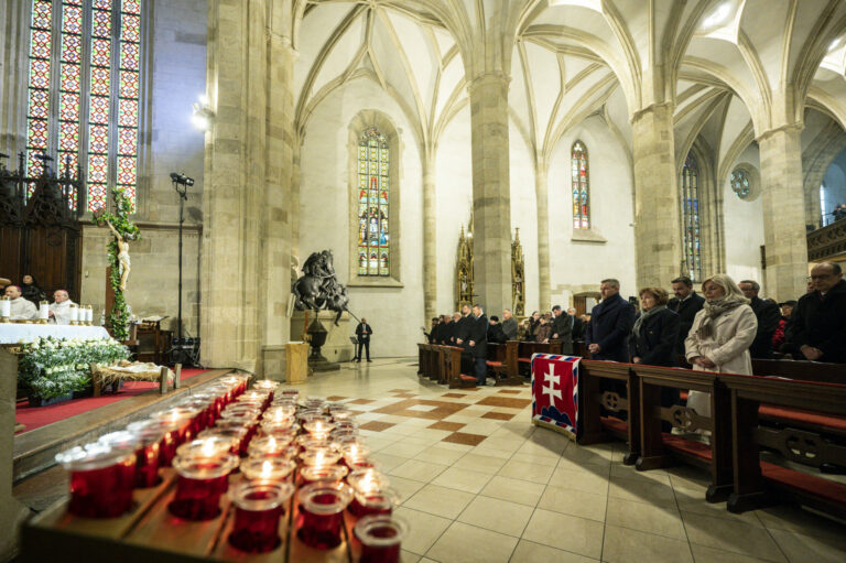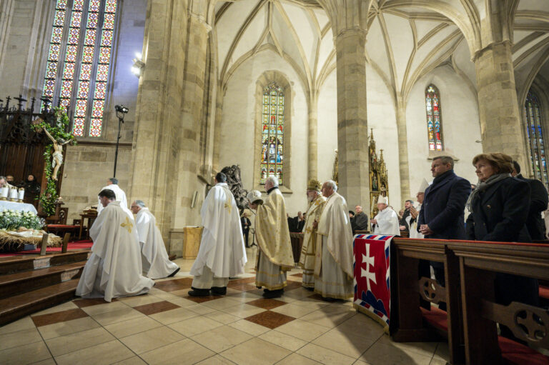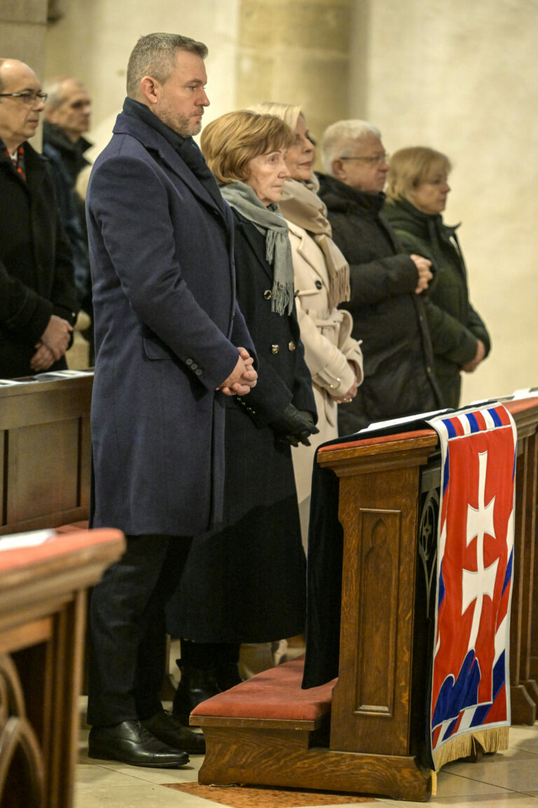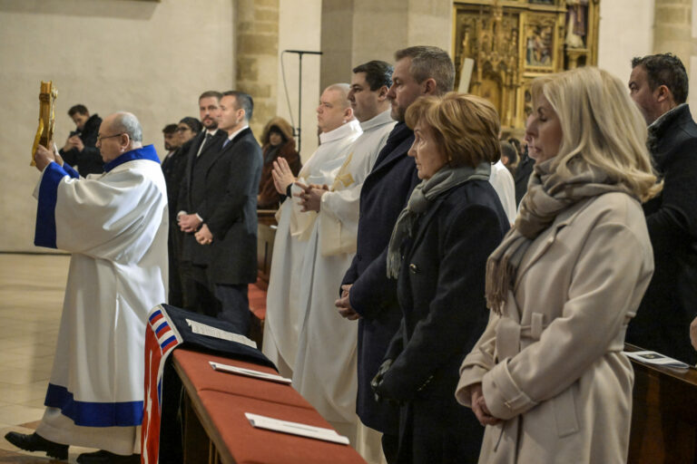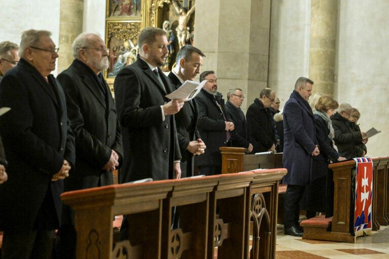 Prezident SR Peter Pellegrini (v popredí tretí sprava) počas slávnostnej svätej omše, ktorá sa konala pri príležitosti štátneho sviatku výročia vzniku Slovenskej republiky v Katedrále sv. Martina v Bratislave. Bratislava, 1. január 2025. Foto: SITA/Milan Illík.