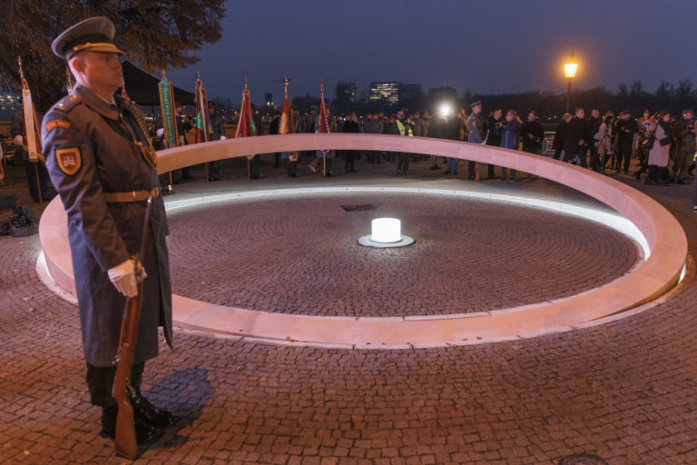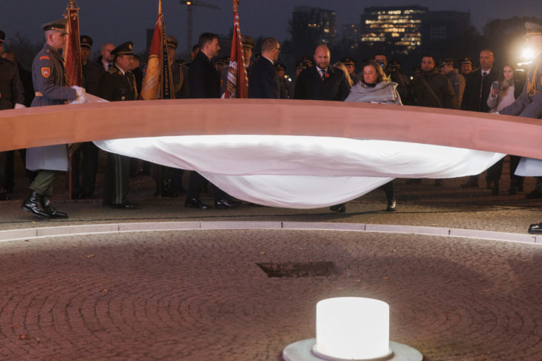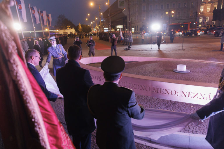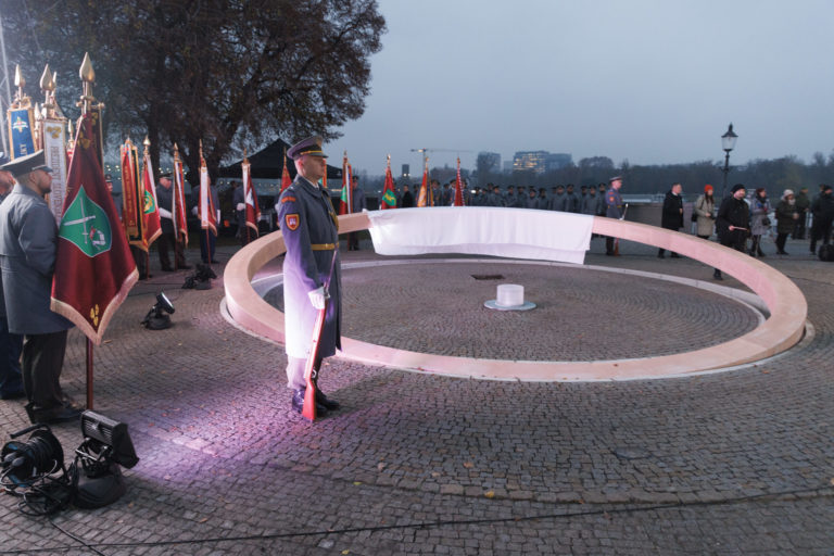 Čestná stráž a pomník počas slávnostného odhalenia Hrobu neznámeho vojaka, uloženia ostatkov neznámeho vojaka 1. česko-slovenského armádneho zboru, ktorý bojoval na Duklianskom bojisku v Karpatsko-duklianskej operácii, symbolického zapálenia večného ohňa a pietneho aktu na Rázusovom nábreží v Bratislave. Bratislava, 5. december 2022. Foto: SITA/Branislav Bibel