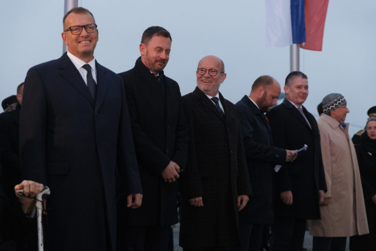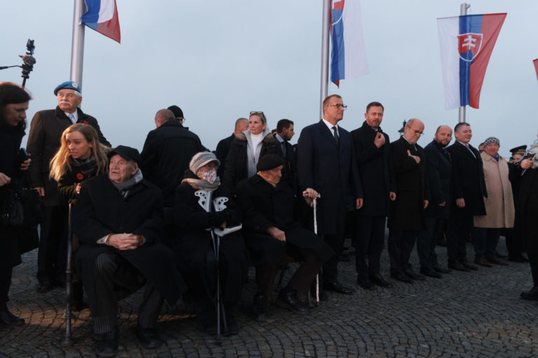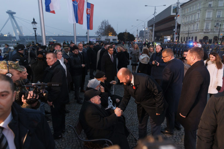 Sprava v popredí: Predseda vlády SR Eduard Heger, predseda NR SR Boris Kollár, minister obrany SR Jaroslav Naï a veteráni počas slávnostného odhalenia Hrobu neznámeho vojaka, uloženia ostatkov neznámeho vojaka 1. česko-slovenského armádneho zboru, ktorý bojoval na Duklianskom bojisku v Karpatsko-duklianskej operácii, symbolického zapálenia večného ohňa a pietneho aktu na Rázusovom nábreží v Bratislave. Bratislava, 5. december 2022. Foto: SITA/Branislav Bibel