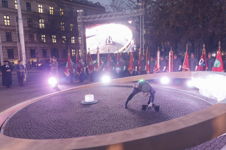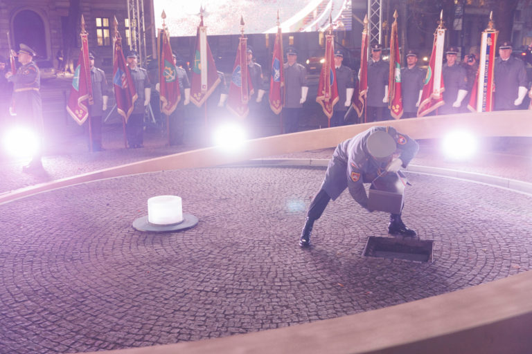 Kladenie ostatkov neznámeho vojaka 1. česko-slovenského armádneho zboru, ktorý bojoval na Duklianskom bojisku v Karpatsko-duklianskej operácii do pomníka počas slávnostného odhalenia Hrobu neznámeho vojaka, symbolického zapálenia večného ohňa a pietneho aktu na Rázusovom nábreží v Bratislave. Bratislava, 5. december 2022. Foto: SITA/Branislav Bibel