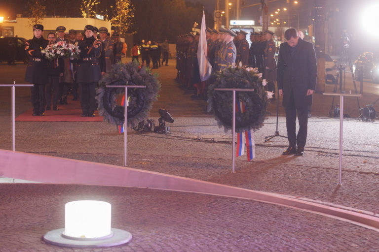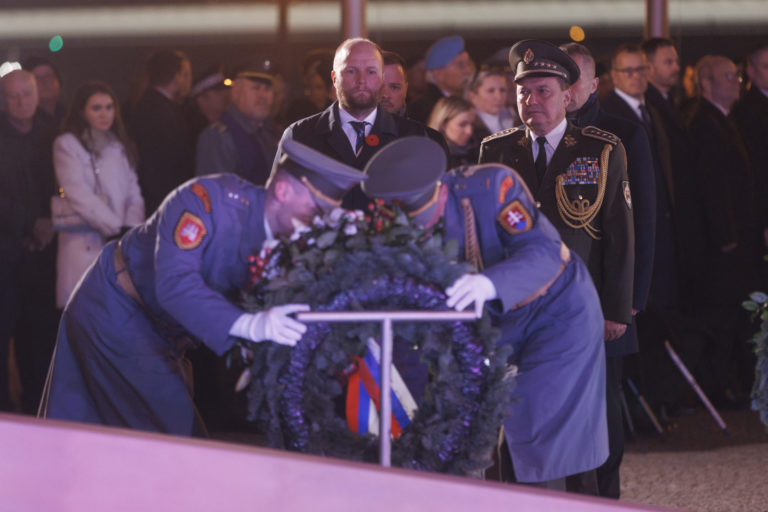 Pietny akt kladenia vencov počas slávnostného odhalenia Hrobu neznámeho vojaka, uloženia ostatkov neznámeho vojaka 1. česko-slovenského armádneho zboru, ktorý bojoval na Duklianskom bojisku v Karpatsko-duklianskej operácii, symbolického zapálenia večného ohňa na Rázusovom nábreží v Bratislave. Bratislava, 5. december 2022. Foto: SITA/Branislav Bibel