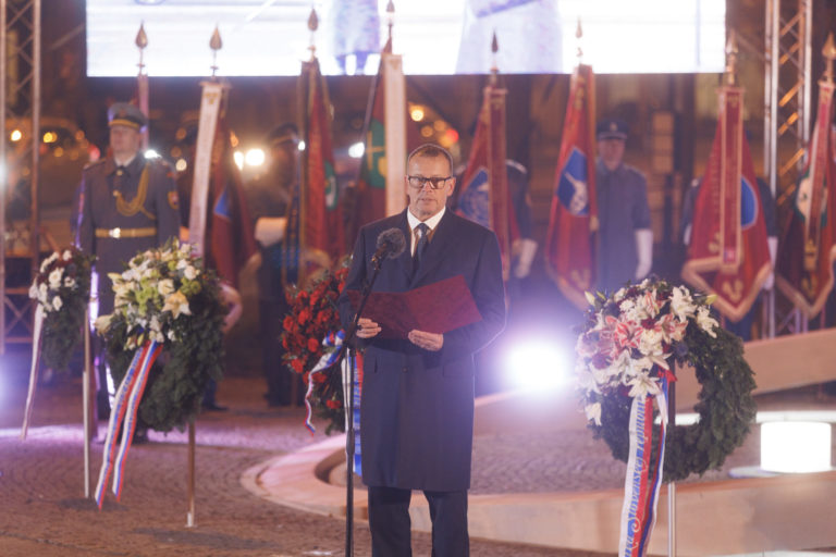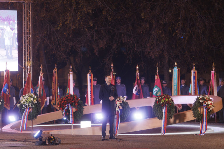 Predseda vlády SR Eduard Heger v príhovore počas slávnostného odhalenia Hrobu neznámeho vojaka, uloženia ostatkov neznámeho vojaka 1. česko-slovenského armádneho zboru, ktorý bojoval na Duklianskom bojisku v Karpatsko-duklianskej operácii, symbolického zapálenia večného ohňa a pietneho aktu na Rázusovom nábreží v Bratislave. Bratislava, 5. december 2022. Foto: SITA/Branislav Bibel