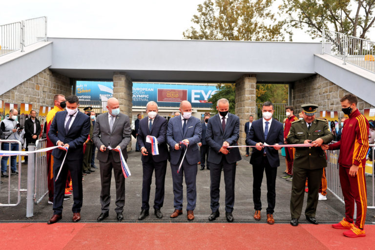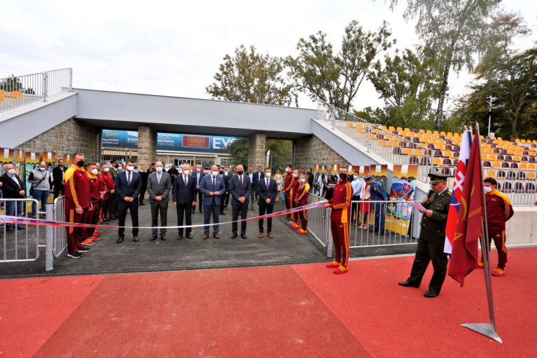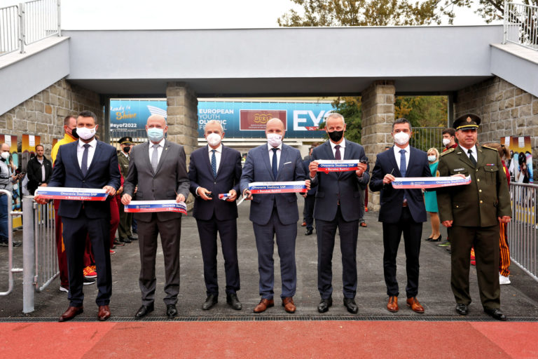 Zľava v popredí: Výkonný riaditeľ Európskeho olympijského festivalu mládeže (EYOF) Peter Hamaj, prezident Slovenského olympijského a športového výboru (SOŠV) Anton Siekel, predseda Banskobystrického samosprávneho kraja (BBSK) Ján Lunter, minister obrany SR Jaroslav Naď, primátor Banskej Bystrice Ján Nosko, predseda Slovenského atletického zväzu (SAZ) Peter Korčok a riaditeľ VŠC Dukla Banská Bystrica Roman Benčík prestrihávajú pásku počas slávnostného otvorenia zrekonštruovaného Atletického štadióna SNP Vojenského športového centra (VŠC) Dukla Banská Bystrica na Štiavničkách. Banská Bystrica, 5. október 2021. Foto: SITA/Peter Rusko