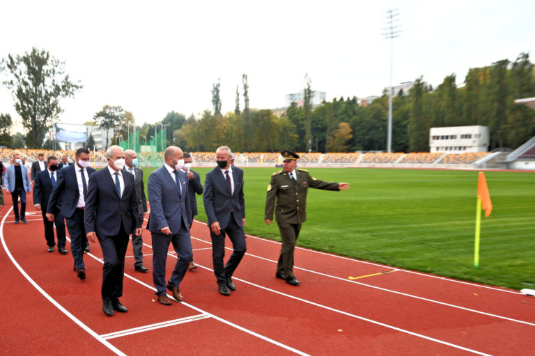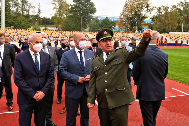 Zľava v popredí: Predseda Banskobystrického samosprávneho kraja (BBSK) Ján Lunter, minister obrany SR Jaroslav Naď a riaditeľ VŠC Dukla Banská Bystrica Roman Benčík počas slávnostného otvorenia zrekonštruovaného Atletického štadióna SNP Vojenského športového centra Dukla Banská Bystrica na Štiavničkách. Banská Bystrica, 5. október 2021. Foto: SITA/Peter Rusko