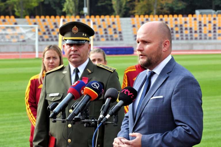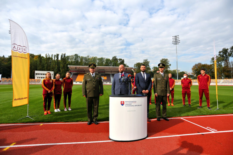 Zľava v popredí: Riaditeľ VŠC Dukla Banská Bystrica Roman Benčík, minister obrany SR Jaroslav Naď, výkonný riaditeľ Európskeho olympijského festivalu mládeže (EYOF) Peter Hamaj a nastávajúci riaditeľ VŠC Dukla Banská Bystrica Matej Tóth počas tlačovej besedy v rámci slávnostného otvorenia zrekonštruovaného Atletického štadióna SNP Vojenského športového centra Dukla Banská Bystrica na Štiavničkách. Banská Bystrica, 5. október 2021. Foto: SITA/Peter Rusko