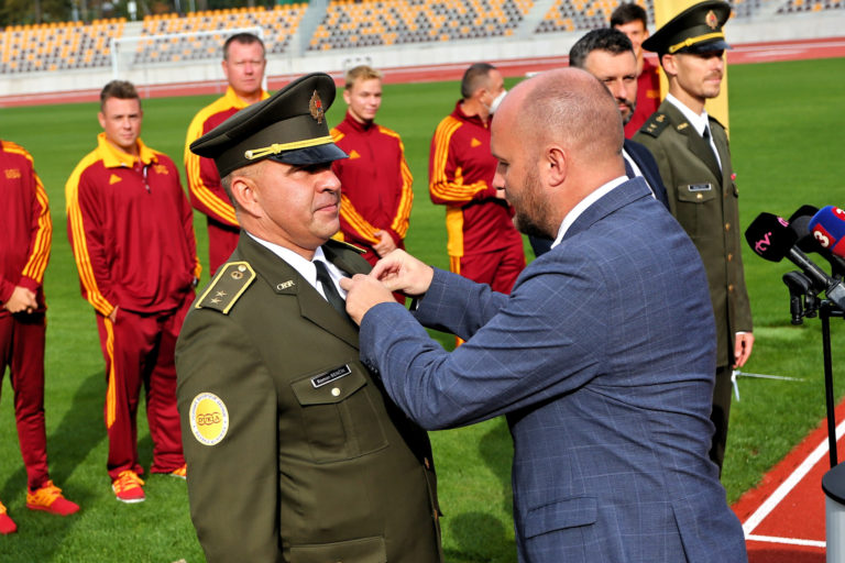 Zľava v popredí: Riaditeľ VŠC Dukla Banská Bystrica Roman Benčík a minister obrany SR Jaroslav Naď počas udeľovania pamätného vyznamenania Romanovi Benčíkovi v rámci slávnostného otvorenia zrekonštruovaného Atletického štadióna SNP Vojenského športového centra Dukla Banská Bystrica na Štiavničkách. Banská Bystrica, 5. október 2021. Foto: SITA/Peter Rusko