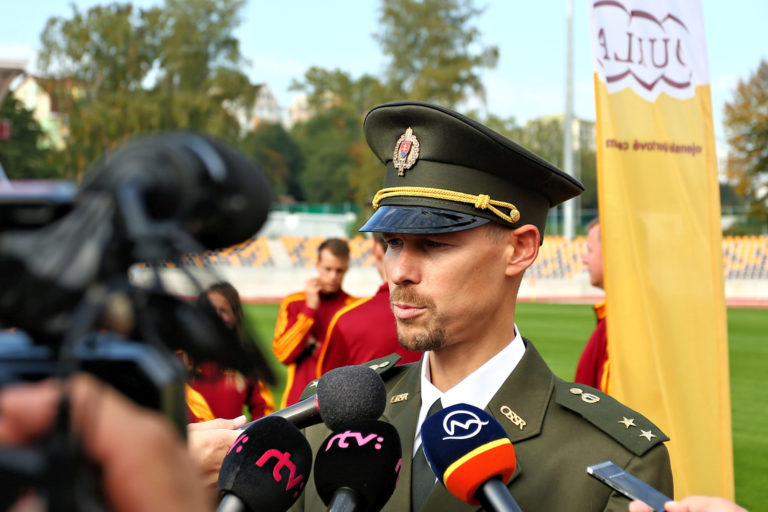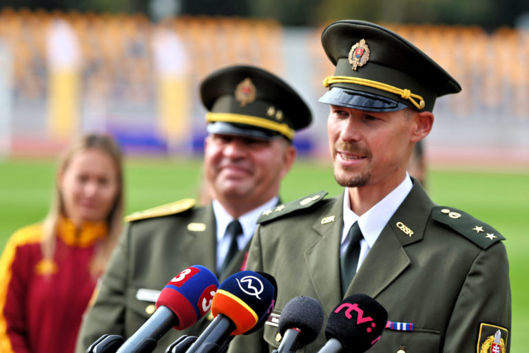 Nastávajúci riaditeľ VŠC Dukla Banská Bystrica Matej Tóth počas tlačovej konferencie v rámci slávnostného otvorenia zrekonštruovaného Atletického štadióna SNP Vojenského športového centra Dukla Banská Bystrica na Štiavničkách. Banská Bystrica, 5. október 2021. Foto: SITA/Peter Rusko